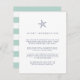Designad för att samordna med vår nautiska matchande brölloppskollektion, har detta kustchica gästinformationskort i mint och marinblått, marinblå bokstäver med en liten vintageinspirerad sjöstjärna illustration högst upp. Ersätt exempeltexten med de viktigaste detaljerna om din bröllopsfest. Baksidan har breda horisontella ränder i blek sjögrön och vit.