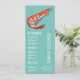 En färgrik och söt meny mall för en modern sjöfruktsrestaurang eller fisk och skaldjur temad middagsfest. Denna söta meny har en söt originalillustration av en räka mot en akvatisk teal strand tema anpassningsbar bakgrund. Texten kan anpassas för att passa dina behov.