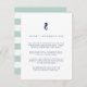 Designad för att samordna med vår nautiska mix-och-match- brölloppskollektion, har detta kustnära chic-gästinformationskort i mint och marinblått, marinblå bokstäver med en liten sjöhästsillustration högst upp. Ersätt exempelttexten med de viktigaste detaljerna om din bröllopsfest. Baksidan har breda horisontella ränder i blek sjögrön och vit.