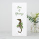 Sjöfartskort och havskort från hälsning med minimalistisk utformning. En brun sjöhäst, med stjärnfisk och dekoration, trycks på kraftverk pappert med texten "Seas & Hälsning" i grönt. Omvänd är tomt. Använda till skriva av en julklapp. Kulkort är ett av många storleka alternativ. Utformningen ser bra ut för alla pappra typer.