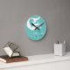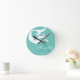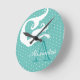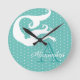Designad av Sandy Closs-delen av den havsmatade dekorn. Personlig med namn monogram Vit sjöjungfru på Aqua Teal Blue Round Clock.