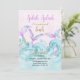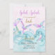 Sjöjungfru party födelsedag med titeln "Splish stänk it is a sjöjungfru bash". Vattenfärgskonstruktion med 3 sjöjungfruar i havet vågar i skuggor av rosa guld lila och turkosblått. Fantasi inbjudan för en flickas födelsedag.