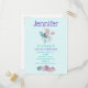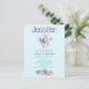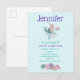 Födelsedagsfest inbjudan vykort med en bra illustration. Designad med en söt sjöjungfru flicka som rider en lycklig delfin. En liten maneter-vän följer med dem. Dekorerad med små stänk av faux guld glitter. Ljusblå bakgrund.