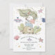 En vattenfärg och illustrerad sjöjungfru, tema 1:a födelsedag. Sjöjungfru kramar stjärnfisk över en vattenfärgad bakgrund med havslevande varelser. En söt konstnärlig vismisk stil inbjudan. Grönt på inbjudan baksida.