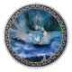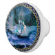 Sjöjungfru med turkoshår på ett sten med ett slott bakom henne. Det har ett vattenfall som leder till havs golv.