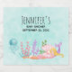 Etiketter för babydusch eller andra evenemang med flaska med söt vattenfärgstryck. En sjöjungfru med långa, blonda hår, lila och vita pärlor. Mörkare och härlig illustration. En maneter från lycklig flyter också med.