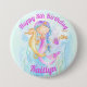 Cute stollig sjöjungfru som kramar hennes sjö 8-knapp/bricka. Kan vara personlig till kostym din egen födelsedag och namn. Perfekt gåva till unga sjöjungfruar. Unik vattenfärgsmålning och design av Sarah Trett för www.mylittleeden.com på zazzle.
