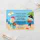för barn i födelsedagsfest inbjudan har en liten flicka utklädd som sjöjungfru och en liten pojke utklädd som pirat på en strand. Den här inbjudan kan användas för pojkar eller flickor.