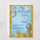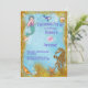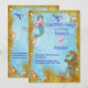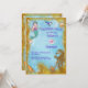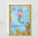 En charmig inbjudan till sjöjungfrufest för barn, med en bedårande liten sjöjungfru (på framsidan och baksidan av inbjudan) och hennes vänner under havet. Det finns också delfiner, snigelskal, sjöstjärnor och en stor gyllene sjöhäste med en pärla som öga. Det finns också pärlor inbäddade i den dekorativa gyllene sand/glitter-randen. Baksidan av kortet visar en större version av sjöjungfrun, med all viktig RSVP-information. All textinformation kan enkelt anpassas genom att klicka på "Anpassa denna mall" ovanför.