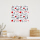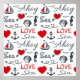 Sömlösa nautiska mönster med sjösymboler (segelbåt, ankare, vinkara, sjömakare, säsongskal) och röda hjärtan dekoration med textdesign på vit bakgrund