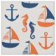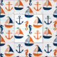 Sömlösa marina mönster med båtar, ankare och sjöhästar i mörk blått färg och orange.