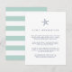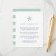Designad för att samordna med vår nautiska mix-och-match brölloppskollektion, har detta kustnära chic-gästinformationskort i mintgrönt och marinblått, marinblå bokstäver med en liten vintageinspirerad sjöstjärna-illustration högst upp. Ersätt exempeltexten med de viktigaste detaljerna om din bröllopsfest. Baksidan på korten har breda horisontella ränder i blek sjögrön och vit färg.