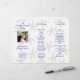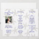 Foto bröllopsprogram att vika i tre delar. Ackordionsvikning med sjöstjärna mönster bakgrund och indigo blå text. Anpassa i tre avsnitt med foto av paret på framsidan. Baksidan av detta papper kommer inte att ha mönstret och kommer att vara enfärgat vitt.