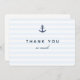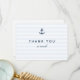 Denna unika, specialdesignade tackkortsmallen med nautiskt tema är perfekt för att tacka gäster och välgångsönskare vid en mängd olika tillfällen, inklusive bröllop, födslar, pensioneringar och andra milstolpar. Den har ett marinblått ankare och text i blått på en bas som inkluderar mjuka blå horisontella ränder. Ankaret är inte enfärgat, det finns små fläckar utan färg, vilket ger en varm, väderbiten look och en handgjord känsla som påminner om ett träsnitt eller en träskulptur. Faktum är att ankarebilden som inspirerade denna design ursprungligen gjordes med en enkel stämpel, vilket förklarar dess charm. På baksidan har vi inkluderat lite platshållartext i blått. Du kan inkludera ditt/dina namn i slutet av ditt anpassade meddelande, eller utelämna dem för att underteckna det för hand. Och naturligtvis, om du föredrar det, kan du göra baksidan helt tom så att du kan skriva ditt meddelande helt för hand. I vilket fall som helst, vänligen se till att