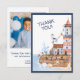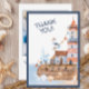 En mjuk kustnära tacksamhetskort med handmålad fyr, segelbåt, sjöfågel och snigelskaldetaljer. Baksidan kan anpassas med ditt eget meddelande och favorit födelsedagsfestfoto.
