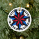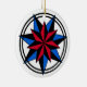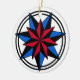 Rund vit dekoration med sju spetsiga stjärnor i rött, blått och svart.
