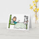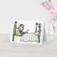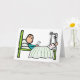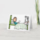 Sjukhussängens design visar en pinnefigur som läser ett kort medan han ligger i sängen. Har ett brutet ben i ett signerat gips som höjs med specialutrustning. Patienten har mysiga kuddar och en avslappnad resignativ attityd till en sjukhusvistelse. Snart frisk igen!