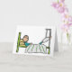 Sjukhussängens design visar en pinnefigur som ligger i sängen med brutet ben i gips höjt ovanför. Bekväma kuddar och en avslappnad uppgiven attityd till en sjukhusvistelse.
