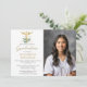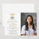 En ömtålig botanisk arrangemang av grönt med mjuka guld-sprinkler (detta är en digital effekt, inte äkta guld-folie), och en guld-caduceus är de elegant dekorationerna för denna enkla, klassiska och moderna inbjudan till sjuksköterskeskolor i studenten med foto, som du kan anpassa helt och hållet med namn i skolan, med examen osv. Det stora mallområdet ger mycket utrymme för att inkludera ceremonin i studenten och firande efteråt, eller anpassa det helt enkelt med information om studentfesten.