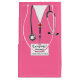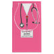 Kreativ design med rosa sjukhusställ och stetoskop. Redigera texten för att lägga till sjuksköterskans eller läkarens namn.