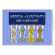 Fyra tecknader med vita katt jackar och håller upp en blå skylt som säger "Medicinsk assistent är fantastisk".