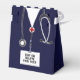 Medicinsk design med marinblå sjukhusskrubbar, stetoskop och schweiziska armén knivar. Redigera text så att du enkelt kan anpassa den.