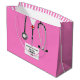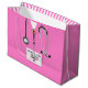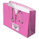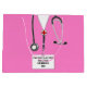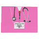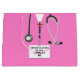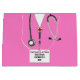 Kreativets medicinska skolväska i studenten för presentväska till doktor student med rosa sjukhusskrubbar och stetoskop. Redigera text för att lägga till doktor, läkarassistent eller sjuksköterskas namn och medicinska referenser.