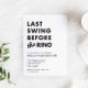 Börja firandet med denna djärva och moderna inbjudan "Sista svingen innan ringen" till möhippa, med ren typografi och en sportig golfinspirerad design. Perfekt för golfrundor, helgutflykter eller avslappnade möhippor, den sätter tonen för ett roligt och minnesvärt evenemang. Anpassa enkelt alla detaljer för att matcha dina planer.