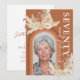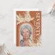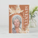 Rustika inbjudningskort för bohemisk 70-årsfest med bränd orange bakgrund och regnbågsformad båge, foto av födelsedagsflickan, akvarell öken torkade palmblad, pampasgräs, blommor och en elegant textmall för sjunde födelsedagsfirande på baksidan som är lätt att anpassa.