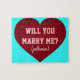 Tittar ni en roligt och ett speciellt sätt att ställa frågan? Titta inte längre! Överraska din älskling med det här unika frieri pusslet som har ett krimson hjärta som täcks av frågan "Vill du gifta dig med mig?" i ett stil-block. Anpassa med din flickvän eller pojkväns namn. Välj teckensnitt stil, storlek, färg och färg i bakgrunden.