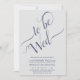 Den vackra bröllopsinbjudan är både enkel och elegant. Blått och grått-designen har finare-kalligrafi med texten "ska vara ved" över arbetsytans 2/3 översta del med enkel text nedan. Modern minimalistisk utformning.