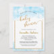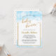 Den här babyduschinbjudan är perfekt för en virtuell babydusch. Utformningen har kalligraftexten guld faux glitter på en blå vattenfärgsbakgrund. Med anpassningsbar kan du lägga till duschinformation.