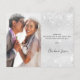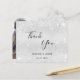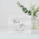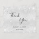 Ett tackkort från bröllop. En faux silver metallisk tittar bakgrund färg. Med faux glitter stoft. På framsidan, ett stort handskript och texten: Tack, namn och ett datum. Tillbaka: Anpassa och lägg till foto, tackkort och namn i bröllop.