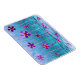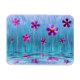 En digital teckning av söt stiliserad lila blommor med strålande röda centrum. De kissar på dig från det höga gräset bredvid en bassäng av tydligt upprivande vatten.