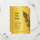En lätt, klok fjäder för påksjuka är en illustrerad guld-bakgrund för inbjudan. Det här Spara datumet är en del av den fullständiga samlingen bröllop Skaka dina Svan-fjädrar och finns på en rad olika färg. com