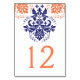 Elegantens fuktade motiv marinblått, korallkort för bröllop bordsnummer i orange. Ett modernt men klassiskt bröllop-mönster med återtändning. Ett känsligt bröllop-mönster med en vintage som känns för det, perfekt för en contemporary eller traditionellt vår eller sommar bröllop.