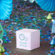 Baby shower med teal sniglar och en lavendel lila akvarell bakgrund
