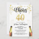 Fira 40-årsdagen (eller vilken ålder som helst) med denna redigerbara CHEERS-inbjudan till 40-årsdagen i svart och guld med guld-stjärnor, trädgårdsremsor och festsken. Modern handskriven manustypografi och champagne, vin eller öl flaskor. Perfekt för vuxens födelsedagar för honom eller henne. Kontakta designern via Zazzle-Chatta eller makeitaboutyoustore@gmail.com om du vill att designen ska ändras, på en annan produkt eller om du vill samordna produkter.