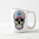 En mycket fantiskt dekorerad skalle i tonvis av färg och prickar.