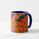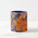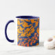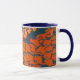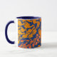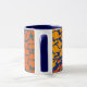 Vit mugg med mörk blått fälg och handtag, dekorerat med skärande tryckt orange av fisk på mörk blått bakgrund