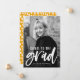 Snyggt, modernt tillkännagivande för studenten med lodrät student med "Cheers to the grad" i ett vitt, handskript. Anpassa början till tillkännagivandet genom att lägga till student namn, namn och studenten. Fotomeddelandet studenten återgår till visningen gult-guld och vit abstrakt-punkt mönster.
