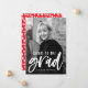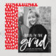 Snyggt, modernt tillkännagivande för studenten med lodrät student med "Cheers to the grad" i ett vitt, handskript. Anpassa början till tillkännagivandet genom att lägga till student namn, namn och studenten. Fotomeddelandet studenten återgår till visningen med en röd och vit abstrakt punkt mönster.