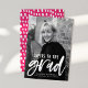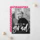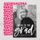 Snyggt, modernt tillkännagivande för studenten med lodrät student med "Cheers to the grad" i ett vitt, handskript. Anpassa början till tillkännagivandet genom att lägga till student namn, namn och studenten. Fotomeddelandet studenten återgår till visningen shock rosa och vit abstrakt punkt mönster.