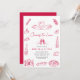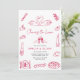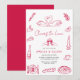 "Cheers to Love" Handritad Retro-Parbröllopsinbjudan har ett lekfullt italienskinspirerat tema med en ren och modern layout. Designen framhäver charmiga röda linjeteckningar som är arrangerade runt ramen. Dessa inkluderar svanar, klickande vinglas, en vinflaska, pizza, bröd, ost, citronskivor, oliver, ett ljus, en kaffekopp och en dukad tallrik. Den enkla handritade stilen ger inbjudan en avspänd och välkomnande känsla, perfekt för en co-ed-firande.