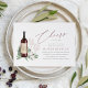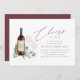 Planerar du en vin-tematisk eller vinsmaknings-inspirerad bröllopsfest eller ska du vara värd för det stora eventet på en vingård eller ett vinodlingsområde? Bjud in dina gäster med våra eleganta vinsmaknings-inbjudningar till bröllopsfest, med en flaska burgunderrött vin och två vinglas och prydd med gröna akvarell-eukalyptusblad och löv. "Skål för kärlek" visas i chic, kalligrafisk typsnittsstil. För en sista touch, kan du anpassa vinflaskans etikett med parets initialer. Perfekt för bröllopsfester i vinlandet, vingård eller vinodlingsmiljö.