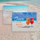 Gott nytt år vykort med texten "Cheers to the new year" på framsidan. Två tropiska drycker sitter på en solstrand bredvid texten med tropiska turkos vatten i bakgrunden. Ta med ditt eget personliga meddelande på baksidan med den tryckta, röda texten eller ta bort texten och köp tomt.