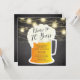 Skål till 70 års födelsedag med en ölpåse mugg på en populär kalkbrädesbakgrund med hängmason burk ljus