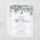 Skaffa till 90 års inbjudan till blå Blommigt Den här inbjudan till roligt innehåller blåa och grönt viner och blommor, handskrivna skript och klassisk typografi.