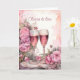 Ett vackert rosa blommor och två bröllopsdag av champagneglas för bruden och brudgummen. "Cheers to kärlek" på utsidan. På insidan: "Önskar du kärlek, skrattar och lyckligtvis efter maj kommer de kommande åren att fyllas med så mycket kärlek"