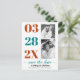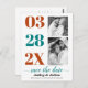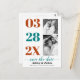 Teal blue och rust två foto Spara vykortet för datum. Det visar datumet i teal- och rosttypografi i en kolumn och två foton av paret. Uttrycket "Spara datumet" finns i skriptet stil typografi.